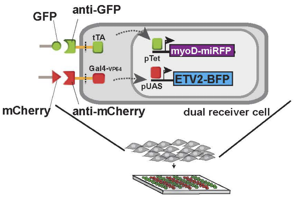 USC researchers have developed a system for precise spatial control of gene expression within multicellular constructs. The technology utilizes engineered cells and matrix materials to present signaling ligands and activate synthetic Notch (synNotch) receptors through customizable material-to-cell signaling pathways, enabling controlled cell differentiation in defined spatial patterns. The approach is generalizable across multiple synNotch receptors and supports dual-lineage transdifferentiation within tissue-relevant geometries. The approach provides powerful capabilities for engineering spatially organized tissues and studying multicellular patterning in developmental biology and regenerative medicine.